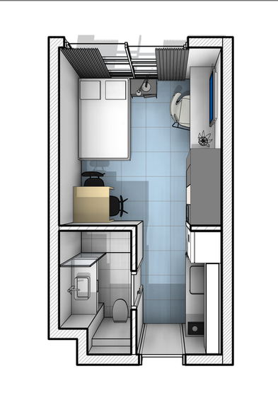 The student co-living residential project is located above a commercial floor, featuring public functions and shared spaces distributed throughout the building.